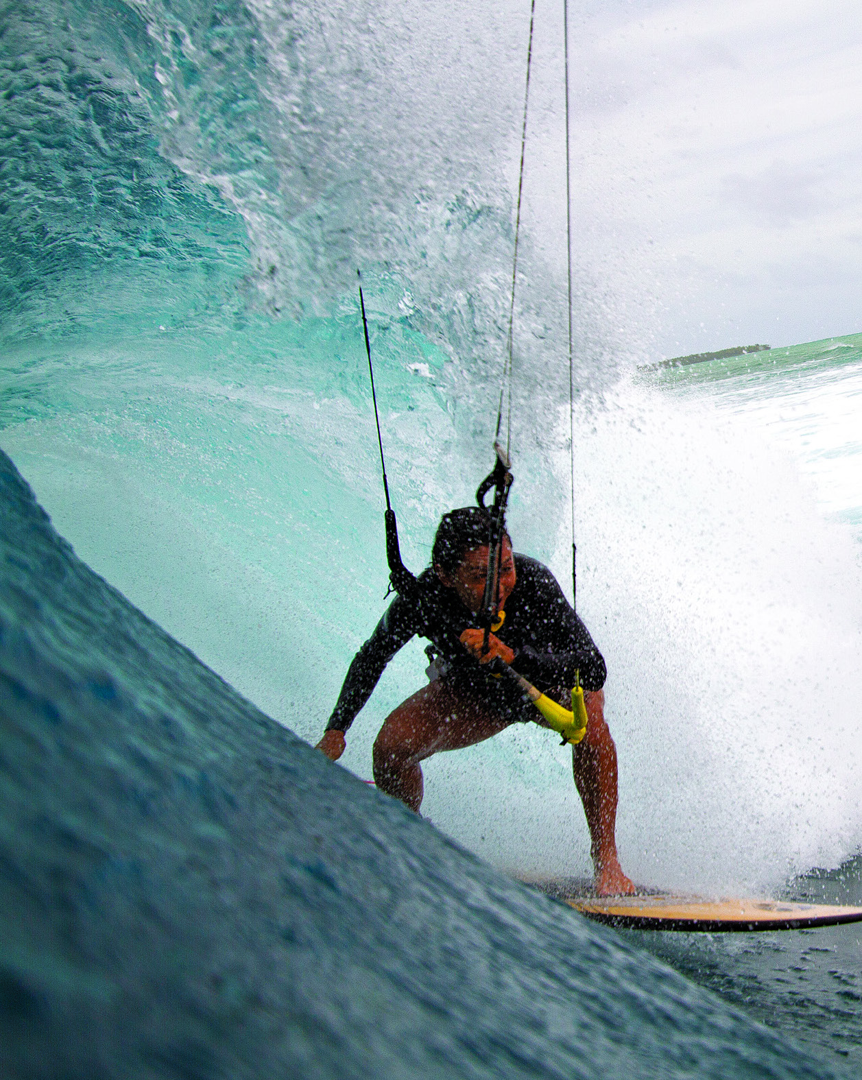 The waves were the perfect size for barrels, and the tide was right, whatever it was. Reo pulled into a big blue cavern in front of me. Keahi did the same on the next one. The rest of us traded smaller waves, hunting for barrels and trying to remember some of Reo’s lessons. I got onto a big set wave and followed it in towards the reef. It was bending and I could tell this one was going to barrel. As it hit the reef and walled up, I tried to wait as long as possible before tucking under. I couldn’t wait any longer, this thing was bowling up in front of me. I set my line and shifted forward, crouching down in case the lip threw over. I was a second too early, and I couldn’t slow down now. I flew down the line, trying unsuccessfully to stall for the barrel. It felt like it went on forever. I flew past the camera, and felt my lines start to cut through the lip. The smile left my face as I quickly reached for my bar and steered my kite to safety. I flew out the end of the wave, unscathed. It was an adrenaline rush, but I knew I was too far in front of the barrel. I headed back out to find another wave, determined to make it inside the blue room this time. Reo saw my attempt and yelled a quick tip to me over the drowning sound of the wind. Somehow, on the next tack I lucked into another good one. It was bending around the reef, and was smaller. The adrenaline must’ve still been kicking because I waited a hair longer than the last time, and as the wave stood up, I was just deep enough. I set my kite low, stepped on the gas and tucked under the lip for a quick vision.