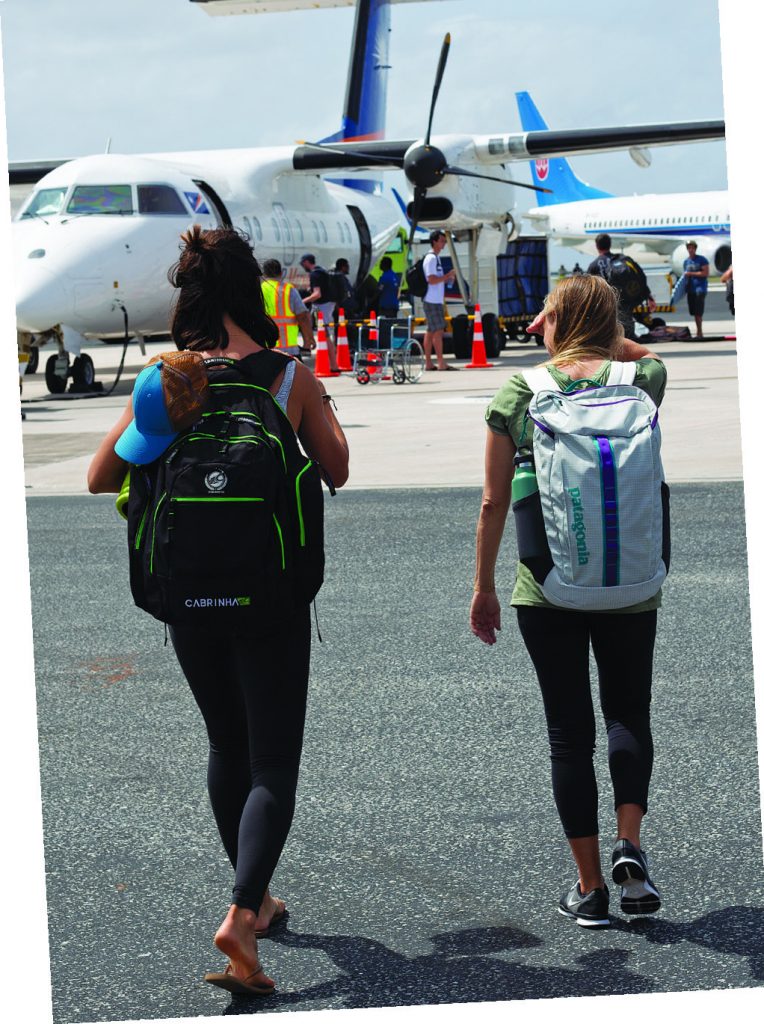 By this point we had met up with five more kiters who were joining the camp. Together we boarded our next aircraft, two per row, filling most of the plane. Keahi was last to board, shuffling board bags on the tarmac so they would all fit in the tiny cargo hold. Finally he made it on, sweating, and we took off in our AC-less flying bus into the sky.