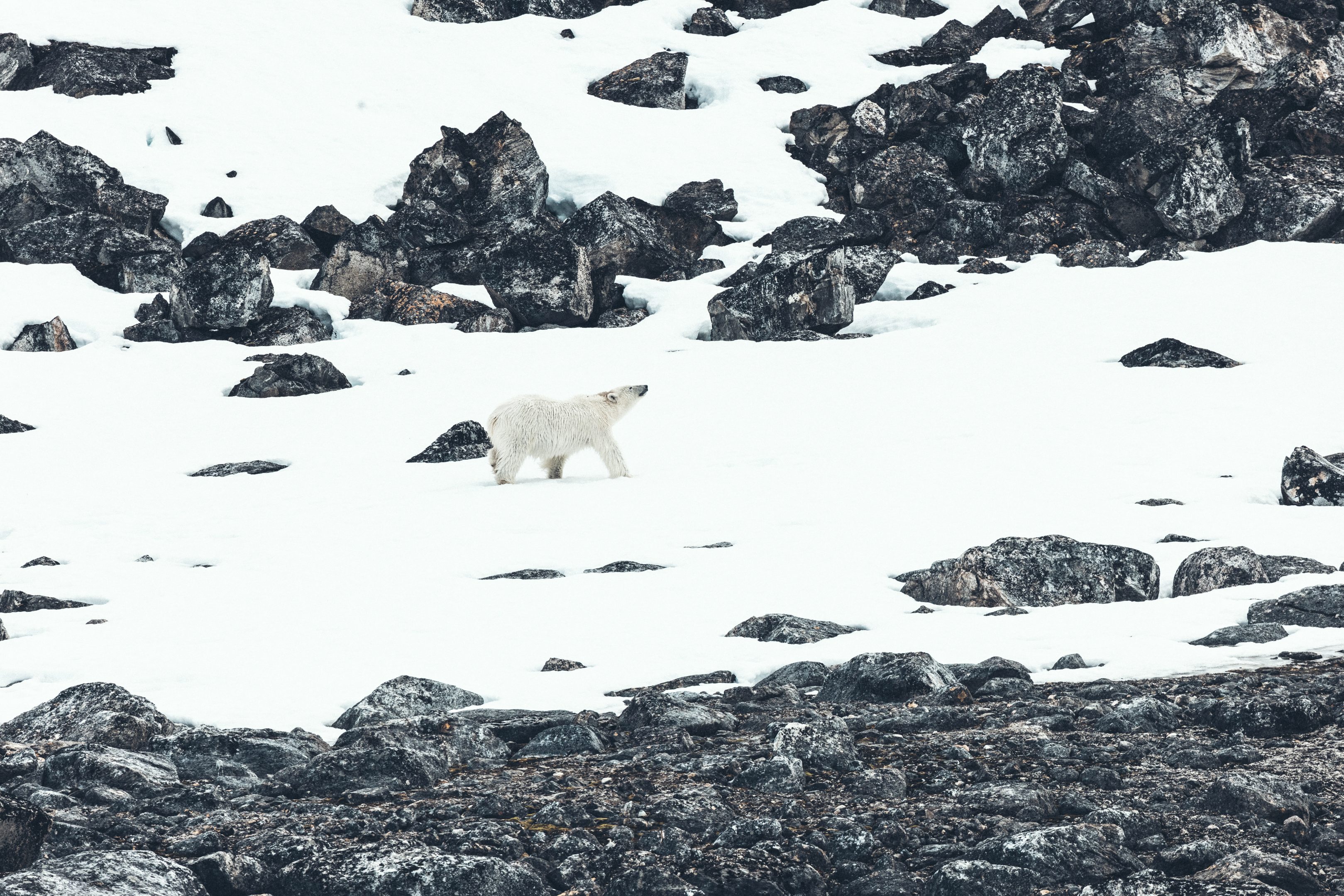 I signal to Olivier that I can’t do anything more. He’s not surprised, but tells me anyway, “That was totally stylish, man.” Jean arrives with the dinghy, and we pack everything up. On the way back, Gaby warns us on the radio that the bear from earlier today is walking around nearby. We get as close as possible while keeping our distance so as not to disturb it. I am frozen from the session, but I don’t even think about it. We are in front of a polar bear.